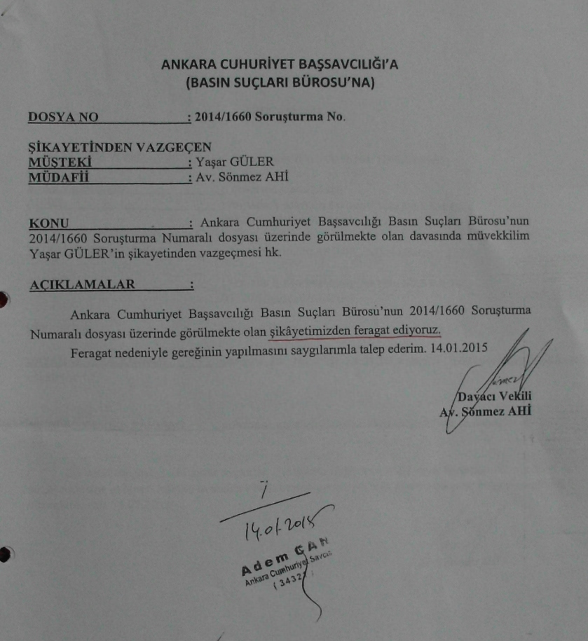 Kuyruğuna takılan Yaşar GÜLER de şikâyetinden caymış idi.