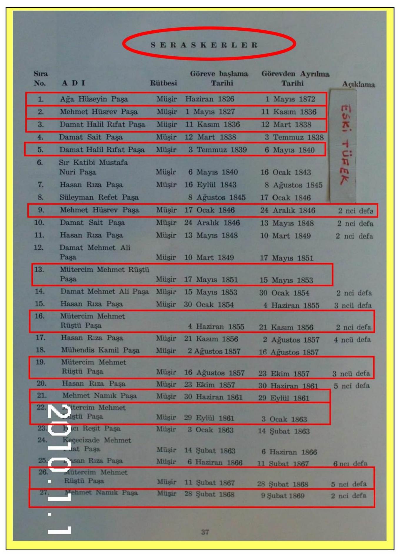 Erlikden Terfili Genelkurmay Başkanları Yukarıdaki kitabın 37 ve 38’inci sayfalarında yer alan Ve aşağıdaki sayfalarda kırmızı çerçeve içinde gördüğünüz askerler; Ordu-yu Osmânî’ye “Er” olarak intisab etdikden sonra Harbiye mezûnu binlerce zâbitden daha üsdün, daha liyâkatli ve daha kâbiliyetli olduklarını isbatladılar. Ve Ordu-yu Osmânî’nin en yüksek rütbesi olan “Müşir” liğe kadar terfi etdiler. Ve dahi Serasker (Millî Savunma Bakanı/Genelkurmay Başkanı) makâmına tâyin edilmeyi başardılar.