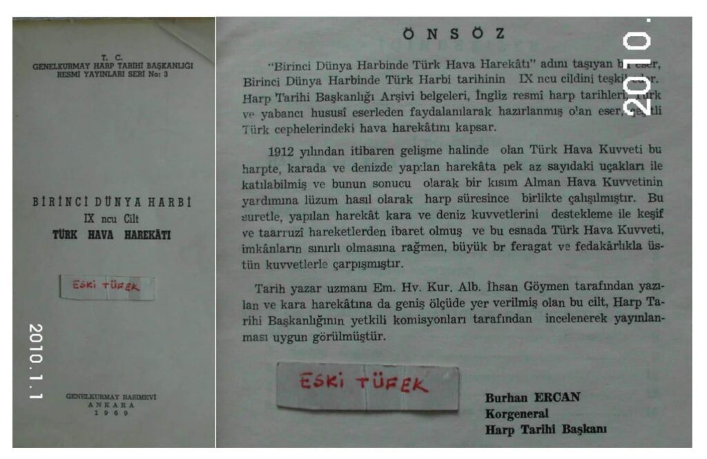 * * * * * Mal mülk düşkünleri rahat yüzü görmezler, Binbir derde düşer, canlarından bezerler. Öyleyken, ne tuhafdır, yine de övünür, Onlar gibi olmayana adam demezler. * * * * * 23 Temmuz 1919 Çarşamba günü Erzurum Kurultayını küşâd ederken Mustafa Kemâl, şu harika vecizi söyledi; “Târih her milletin kanını, hakkını, mevcudiyetini hiçbir zamân inkâr edemez!” Bizim bu makâlemize konu etdiğimiz hususda da Târih, bir milletin değil fakat Küçük zâbit denilen askerlerin kanını, hakkını ve mevcudiyetini inkâr edemedi. Tam 101 sene evvel târihde vuku bulan Ve dahi Tam 48 sene evvel târih kitabında ölüm uykusuna yatırılan bir hakikât daha Bugün, burada Eski Tüfek’in kaleminde tekrâr hayât buldu! * * * * * Uğruların vay hâline!.. Târih, böyledir işde! Eğrisi ile doğrusu ile bir gün gelir, kendini teşhir eder! 27 Mayıs subay darbesinin hava gazı ile cezbeye tutulup Şöhret orgazmı olan beyaz zâbitân heyetimiz, Genelkurmay Başkanlığının arşivindeki belgeleri incelediler Ve dahi 1969 senesinde bir kitap neşretdiler. Bu kitabın adı “Birinci Dünya Harbi – IX’uncu Cilt, Türk Hava Harekâtı” Târih yazar uzmanı dedikleri Em.Hv.Kur.Alb. İhsan GÖYMEN’e yazdırdıkları işbu kitabı;