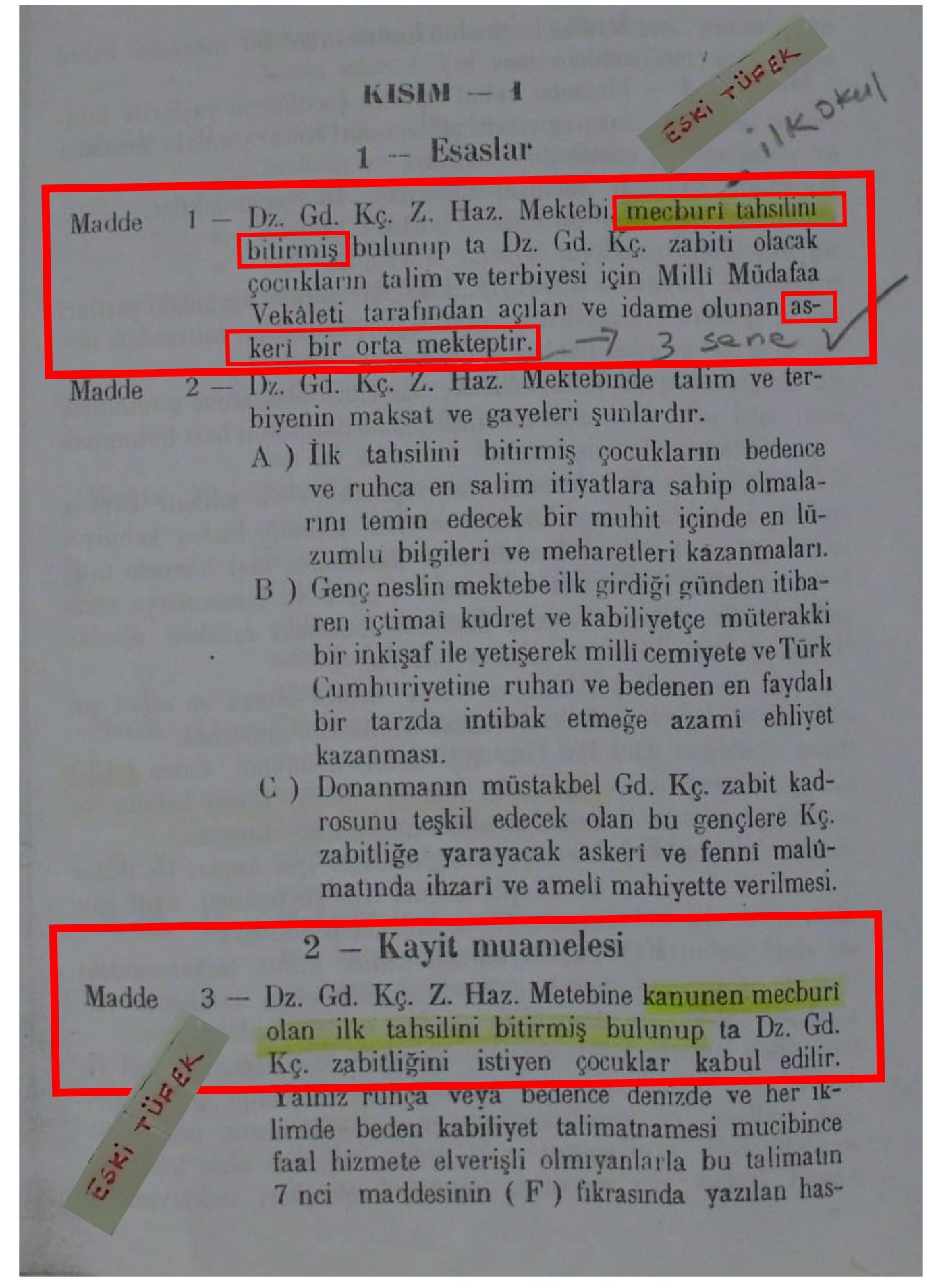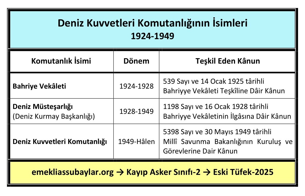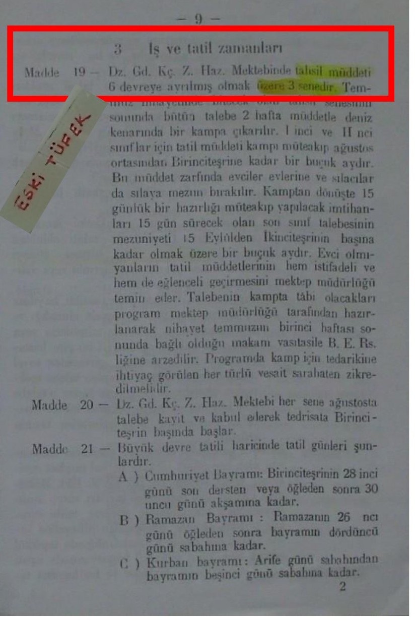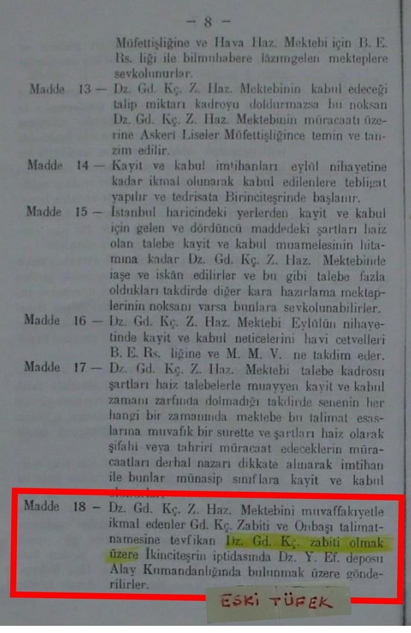 - 789 Sayı ve 03 Nisan 1926 Târihli Maârif Teşkilâtına Dâir Kânun. 2505 Sayı ve 11 Haziran 1934 târihli Gedikli Küçük Zâbit Membalarına Dâir Kânun.