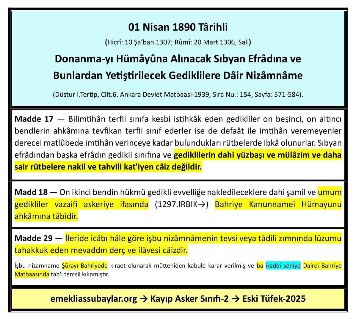 - 01 Nisan 1890 (R. 20 Mart 1306) Târihli Donanma-yı Hümâyûna Alınacak Sıbyan Efrâdına ve Bunlardan Yetiştirilecek Gediklilere Dâir Nizâmnâme. (Düstur, I.Tertip, Cilt.6. Ankara Devlet Matbaası-1939, Sıra Nu.:154, sayfa: 571-584).